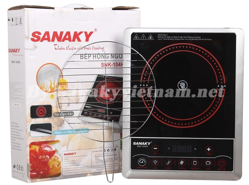 Bếp hồng ngoại Sanaky SNK-104HG là sản phẩm nằm trong dòng bếp hồng ngoại dương, đơn của Sanaky, thiết kế mỏng nhẹ, dễ dàng di chuyển. Sản phẩm có màu đen tuyền sạch sẽ, các phím bẩm cảm ứng nhanh nhạy, dễ dàng sử dụng. Ngoài chức năng chiên, xào, nấu,… thông thường, Bếp phù hợp để nướng thực phẩm với vỉ nướng đi kèm.