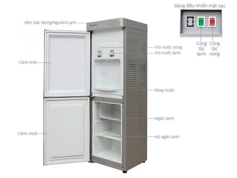Ngăn dưới của cây nước này là ngăn chứa đồ, là nơi để ly các vật dụng liên quan, như cafe, đường,…
