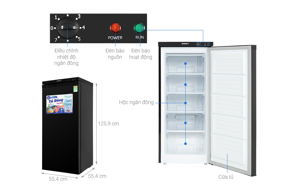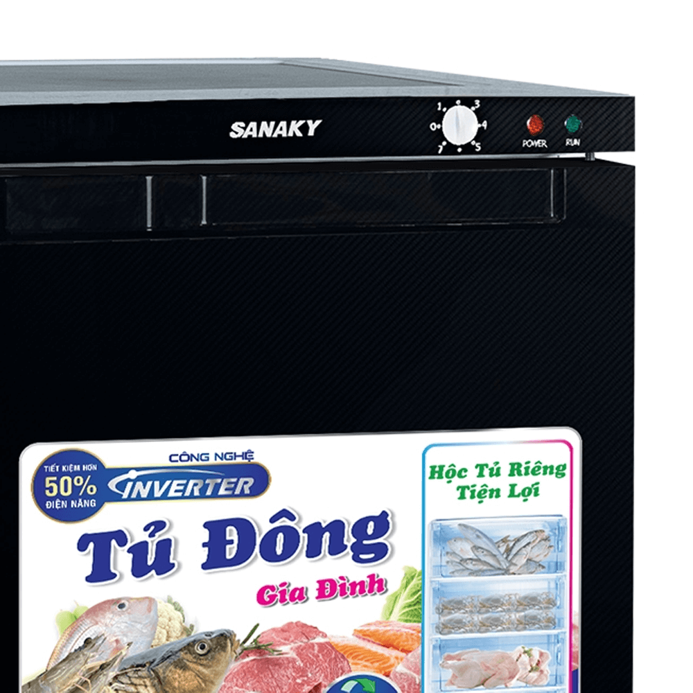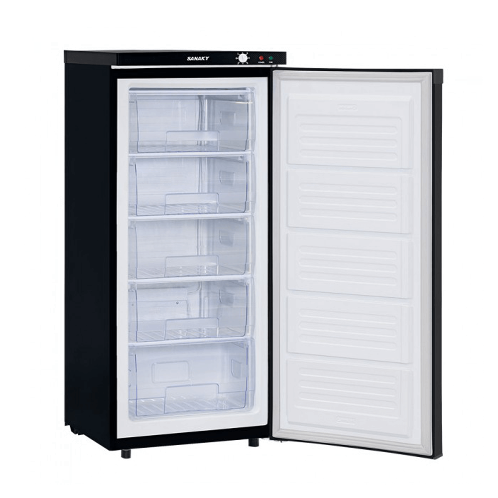 - Tủ đông Sanaky được thiết kế 1 cửa với 5 ngăn đông, nhỏ gọn, mang gam màu trắng thanh lịch, nên có thể đặt bất kì đâu trong khu vực phòng bếp, góc nhỏ của phòng khách hoặc trước sảnh để thuận tiện cho việc kinh doanh, buôn bán.