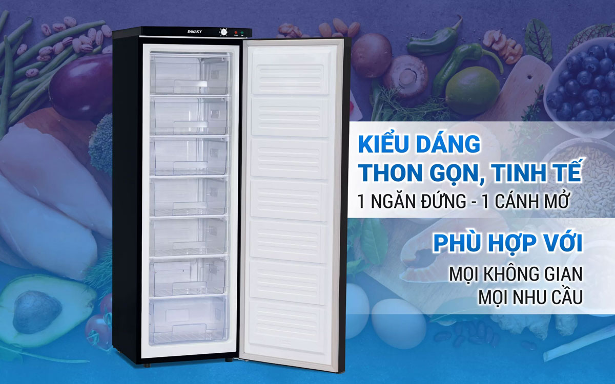 Tủ Đông Đứng Sanaky VH-230VD3 213 lít được thiết kế 1 ngăn đông dạng đứng với 1 cánh mở, có thiết kế nhỏ gọn, sang trọng, giúp tủ có thể hài hòa với không gian người dùng một cách dễ dàng mà không tốn nhiều diện tích.
