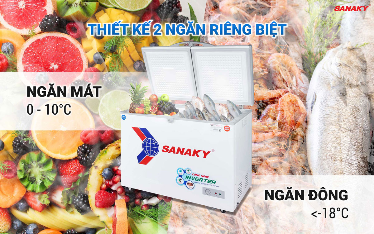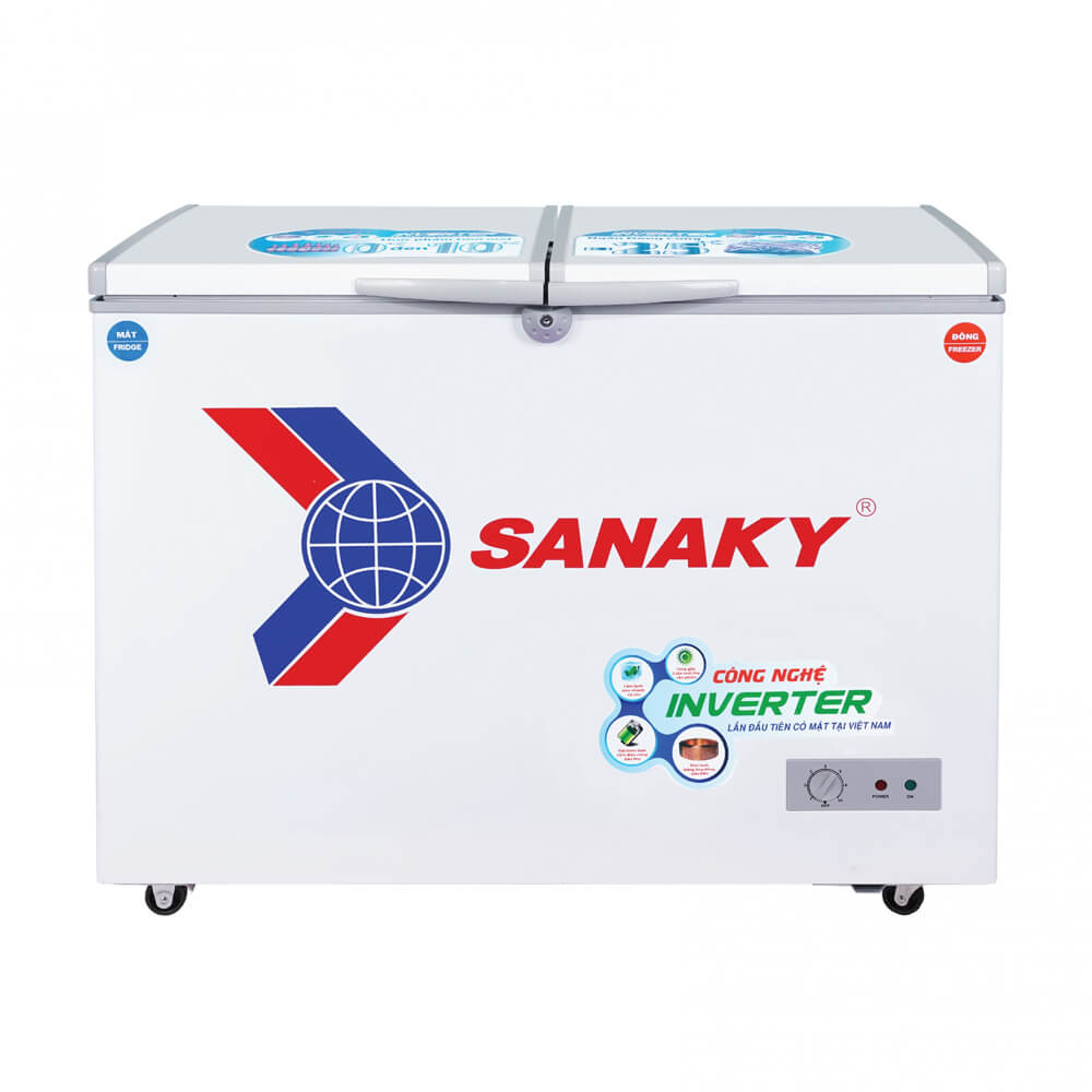 - Thiết kế: Tủ đông Sanaky VH2899W3 gồm 2 ngăn đông – mát và 2 cánh mở giúp dễ dàng phân loại thực phẩm
