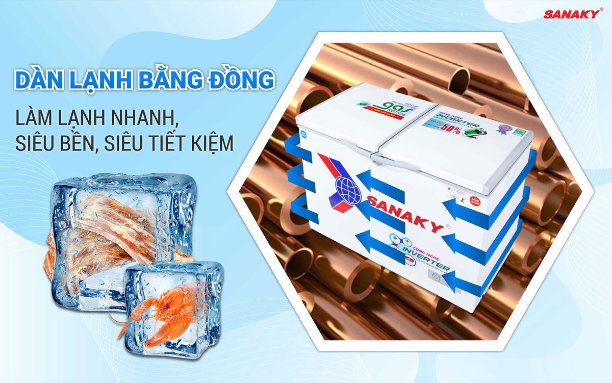 - Dàn lạnh bằng đồng: Tủ đông Sanaky 2899W3 có dàn lạnh được làm bằng đồng nguyên chất giúp cho nhiệt độ làm lạnh đạt đến -18°C nhanh chóng, giữ nhiệt độ sâu, tăng hiệu suất làm lạnh. Ngoài ra dàn lạnh đồng có độ bền cao, giúp tủ vận hành êm ái phù hợp sử dụng trong không gian nhỏ.