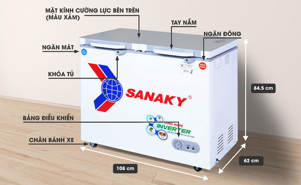 Tủ có được chia làm 2 ngăn: ngăn đông và ngăn mát riêng biệt, có dán nhãn chỉ dẫn tiện quan sát, tủ đông Sanaky cho phép bạn dễ dàng phân loại thực phẩm để bảo quản.