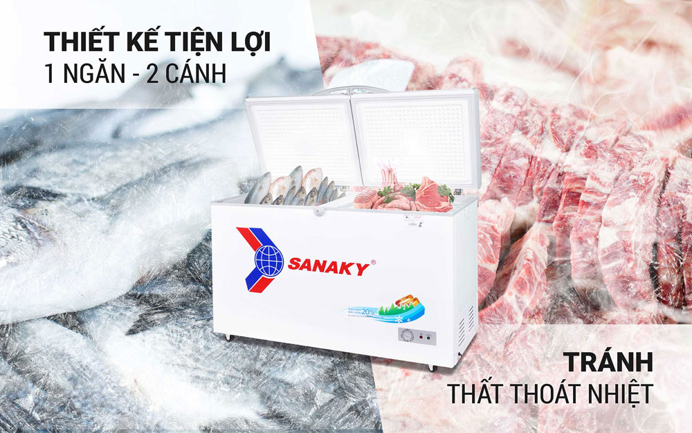Tủ đông Sanaky 400 lít thuộc dòng tủ đông tủ đông dàn đồng một ngăn hai cánh với dung tích cỡ nhỏ trong dòng sản phẩm của Sanaky. Sản phẩm đáp ứng được nhu cầu bảo quản, trữ đông thực phẩm với số lượng ít, thích hợp cho gia đình các cửa hàng tạp hóa hay các bếp ăn và nhà hàng nhỏ.