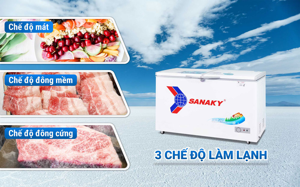 Tủ Đông Sanaky VH-4099A1 có 1 ngăn đông nhưng lại có đến 3 chức năng với các mức điều chỉnh nhiệt độ khác nhau để có thể phù hợp với nhu cầu sử dụng của người dùng: