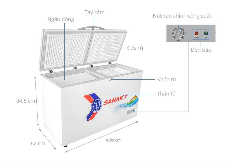 Tủ được thiết kế 2 nắp dở, giúp cho bạn dễ lấy và cho vào thực phẩm bên trong tủ cũng như giảm bớt tình trạng hơi lạnh thoát ra ngoài gây tiêu hao điện năng.