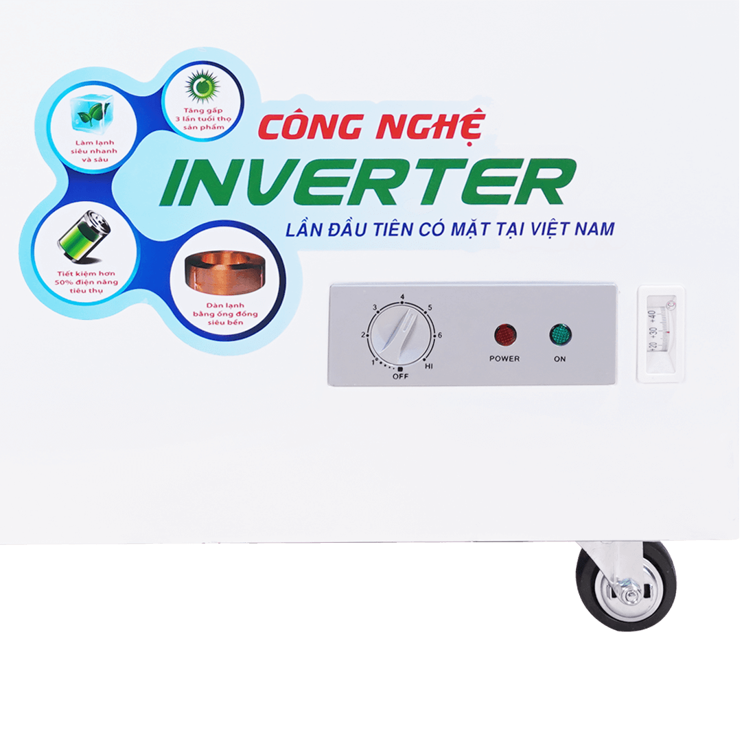 - Tủ được tích hợp thêm công nghệ inverter mới nhất, giúp kiểm soát hệ thống làm lạnh của máy tránh những hao phí không đang có. Tiết kiệm điện năng lên tới 50% so với dòng tủ đông thông thường.