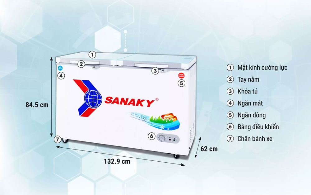 Công nghệ làm lạnh 360 độ: kết hợp với dàn lạnh đồng, công nghệ làm lạnh 360 độ giúp hơi lạnh sẽ được tỏa đều bên trong tủ, tác động toàn diện lên bề mặt thực phẩm, đem đến hiệu quả làm lạnh sâu, đóng đông triệt để.
