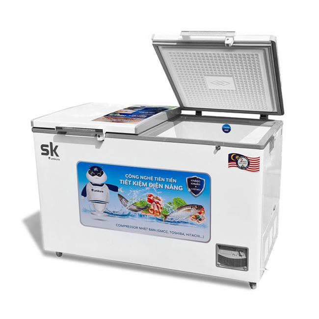 - Tủ đông SK được tích hợp công nghệ Inverter cho khả năng giảm điện năng tiêu thụ và giúp máy vận hành được êm ái hơn.
