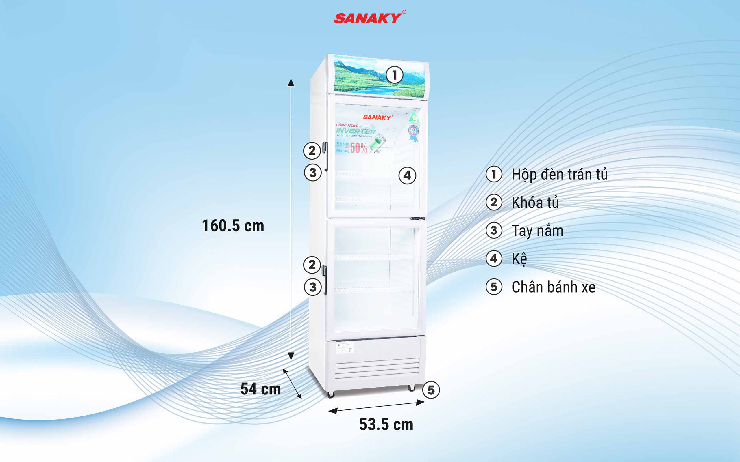 Tủ Mát Sanaky VH-218W3L có kích thước chỉ 535 x 540 x 1605mm cùng thiết kế kiểu tủ mát 2 cánh trên dưới giúp giảm thiểu hơi lạnh thoát ra khi lấy thực phẩm trong tủ