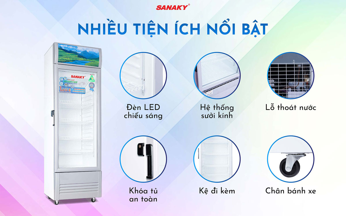 Đèn LED: Tủ mát Sanaky được thiết kế với hệ thống đèn LED dọc theo hông và nóc tủ, chiếu sáng toàn bộ các góc khuất giúp trưng bày các sản phẩm bắt mắt và thu hút. Hơn nữa, hệ thống đèn LED còn tiết kiệm điện năng và có tuổi thọ bền bỉ hơn nhiều lần so với các loại đèn huỳnh quang, đèn sợi đốt,… mang lại giá trị sử dụng lâu dài cho người sử dụng.