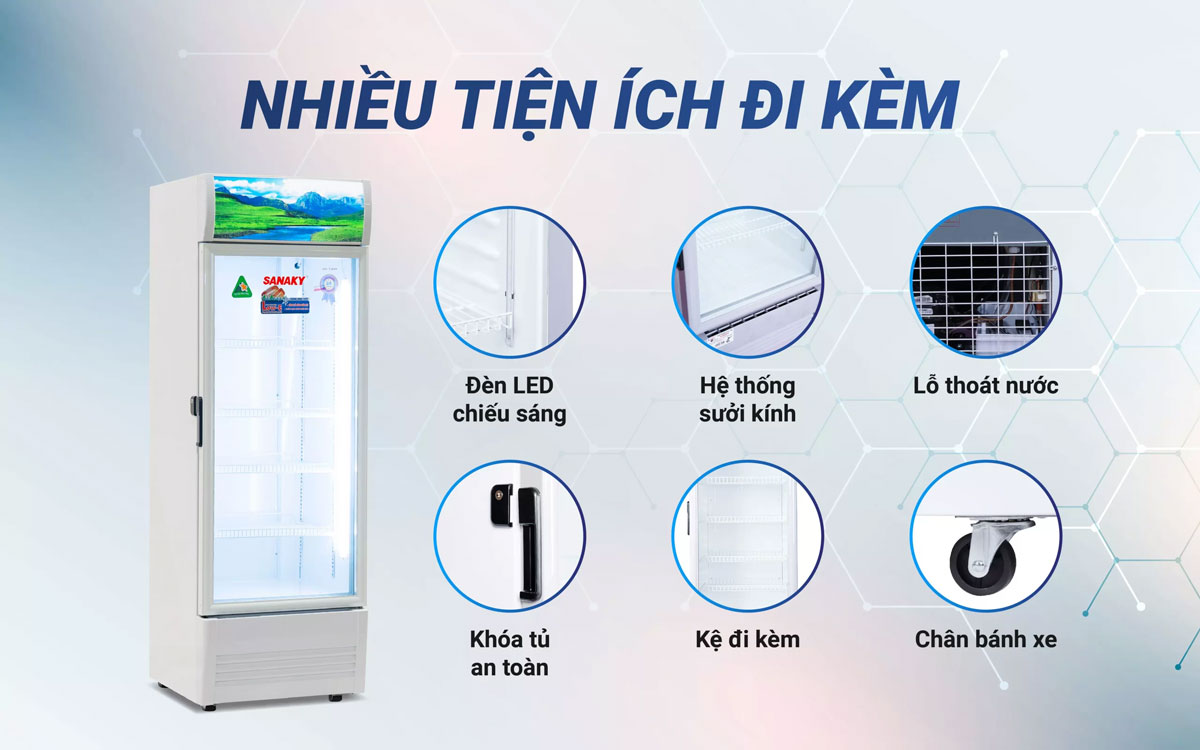 Đèn LED: Tủ mát Sanaky được thiết kế với hệ thống đèn LED dọc theo hông và nóc tủ, chiếu sáng toàn bộ các góc khuất giúp trưng bày các sản phẩm bắt mắt và thu hút. Hơn nữa, hệ thống đèn LED còn tiết kiệm điện năng và có tuổi thọ bền bỉ hơn nhiều lần so với các loại đèn huỳnh quang, đèn sợi đốt,… mang lại giá trị sử dụng lâu dài cho người sử dụng.
