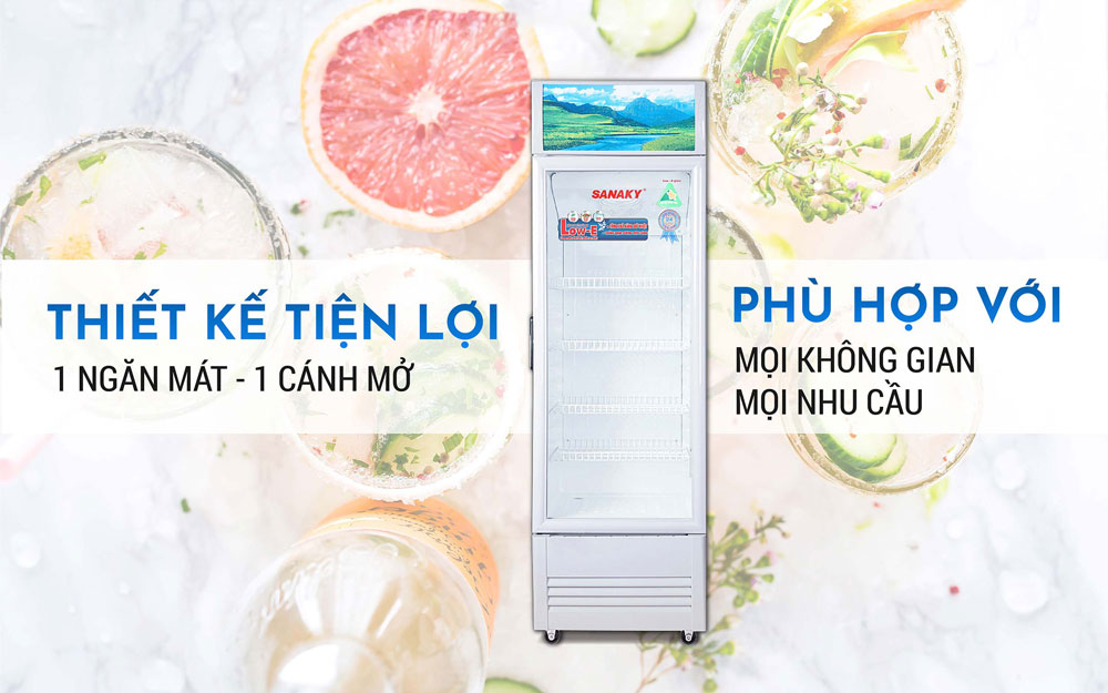Tủ mát được thiết kế với 1 cánh cửa kính mở trong suốt tinh tế, nhỏ gọn và không chiếm nhiều diện tích. Với dung tích và kích thước của mình thì đây là sự lựa chọn phù hợp cho các cửa hàng tạp hóa, cửa hàng tiện lợi và quán nước gia đình.