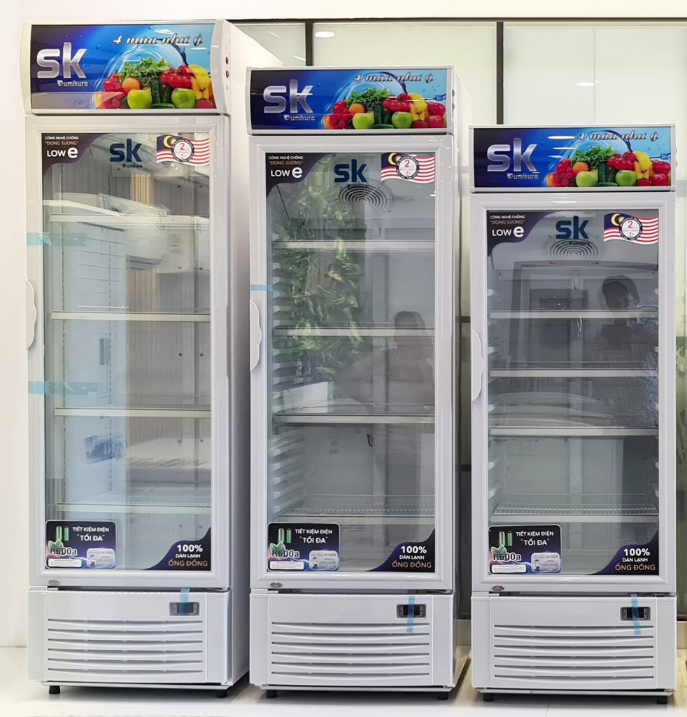 - Cửa kính 2 lớp hút chân không chắc chắn, cách nhiệt hiệu quả giúp tủ mát Sumikura SKSC-400I/FC giữ lạnh tốt hơn và tiết kiệm điện năng.